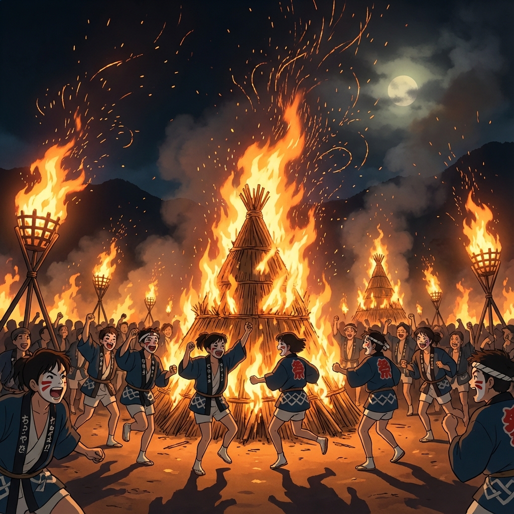 Der Ursprung dieses Festes liegt in einer Legende, die mit Kaiser Ojin verbunden ist. Als Kaiser Ojin den Biwa-See überquerte und in Minamitsuda an Land ging, um den Geburtsort seiner Mutter, Kaiserin Jingu, zu besuchen, sollen sieben Häuser Fackeln aus Schilf vom Seeufer angezündet haben, um ihm den Weg nach Hachiman zu weisen. Dies gilt als Prototyp des Hachiman Matsuri, ein Traditionsfest, das seit 275 n. Chr. über viele Jahrhunderte hinweg weitergegeben wird.