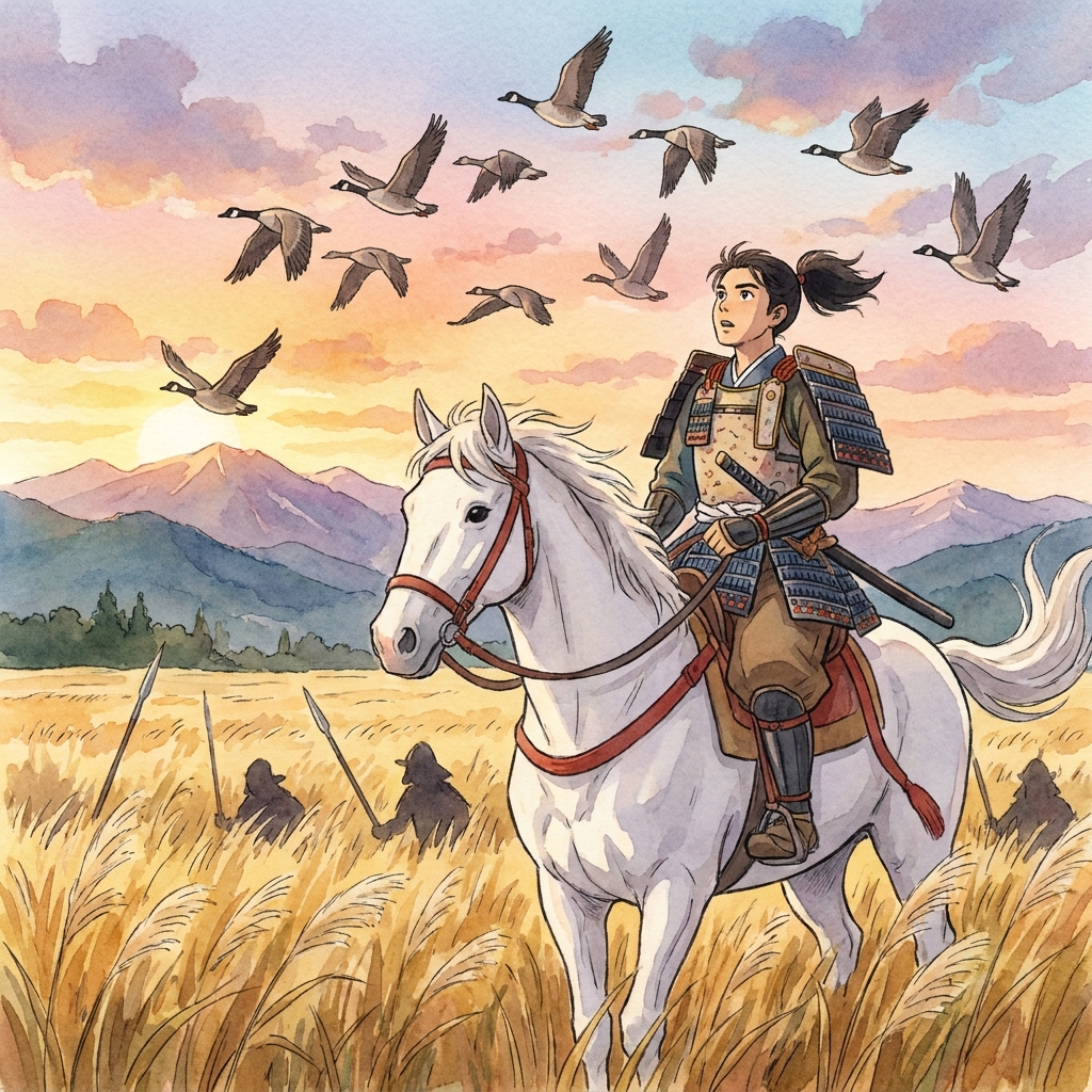 When attacking the forces of Kiyohara Takehira and Iehira, who were holed up in Kanazawa no Saku, Yoshiie looked up at the sky during his advance and witnessed a flock of geese, flying in a neat line, suddenly break their formation. Yoshiie recalled the military strategies he had once studied and intuitively felt, “When the geese break formation, it’s a sign that there are hidden troops below.” Indeed, enemy ambushers were hiding in the grass, and it is said that Yoshiie, by noticing this anomaly, was able to escape a critical situation and turn the tide of battle to his advantage.