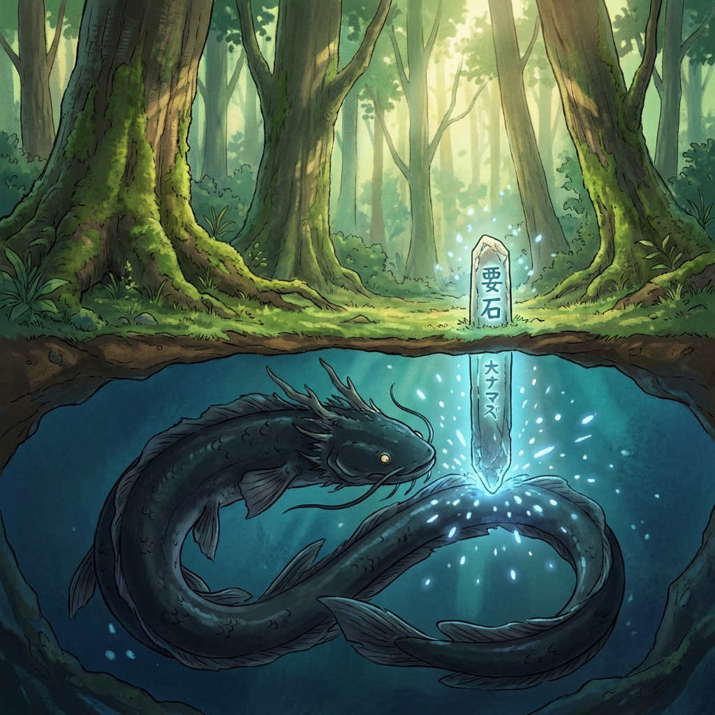 古来、地震は地中に住む巨大な「大ナマズ」が暴れることで起こると信じられていました。香取神宮の経津主大神と鹿島神宮の武甕槌大神は、このナマズを抑え込むために巨大な石棒を地中深くへ差し込んだと伝えられています。香取神宮の要石はナマズの「尾」を、鹿島神宮の要石は「頭」を押さえているといわれ、二つの石は地中でつながっているという伝説もあります。
