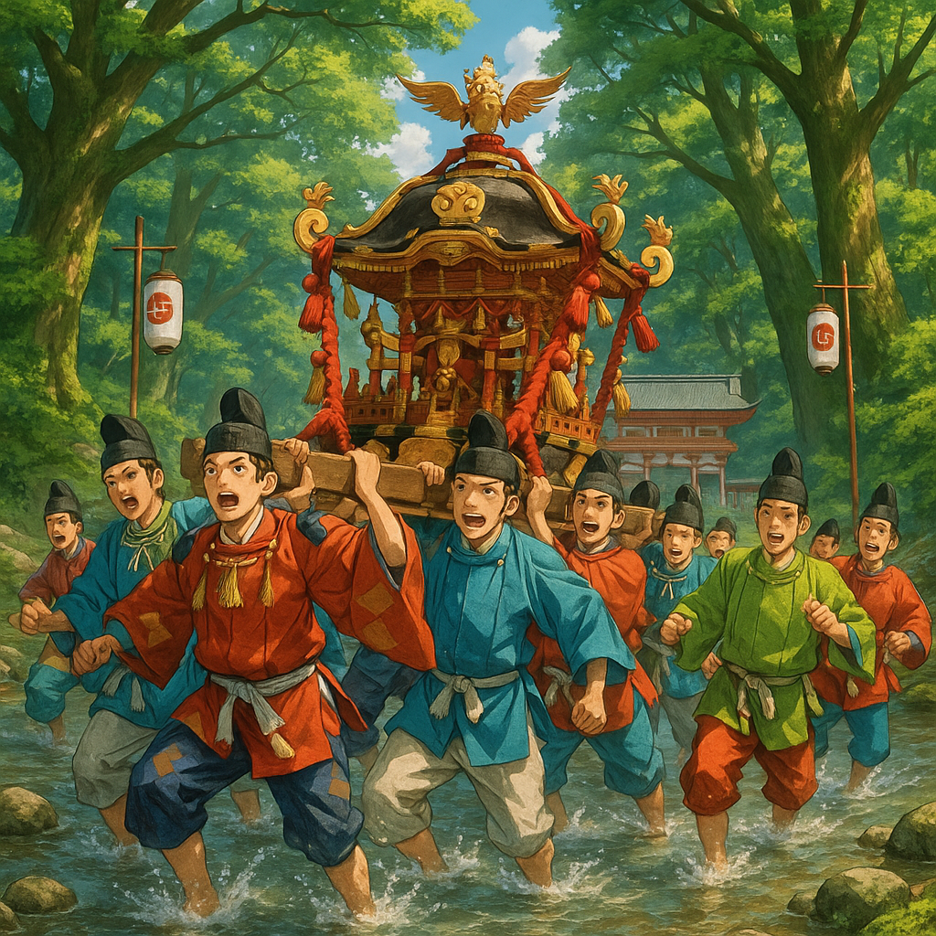 八坂神社の祭事は、地域住民の信仰と一体となって行われています。 特に、5月1日に行われる川枯祭は圧巻です。前日には初老の厄男が獅子頭を持って氏子全戸を巡り、当日は午前中の祭典に続き、午後には神輿渡御が行われます。 元禄模様の衣装をまとった若衆60人が野洲川を渡る勇壮な姿は、まさに地域一体となって神事を祝う様子を表しています。 1月7日に行われる「的山のおこない」は、家内安全や家運隆昌を祈願する宮座の行事です。