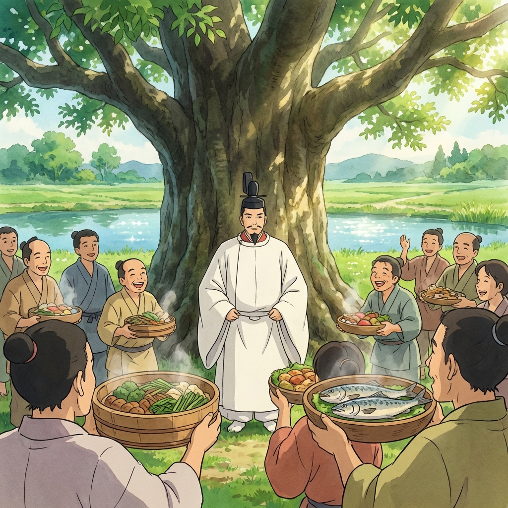 この神社を語る上で欠かせないのが、鎮座地である「大饗」という不思議な地名です。「大きな饗(あえ)」、つまり「盛大な宴会」を意味するこの名前には、仁徳天皇にまつわる伝説が残されています。